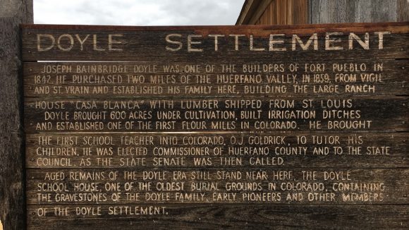 Today, the Doyle Settlement retains the cemetery and school building and is a beacon overlooking the Huerfano River Valley at the very southern edge of Pueblo County, about 25 miles southeast of Pueblo. The cemetery is one of the oldest burial grounds in Colorado and contains the gravestones of the Doyle family, early pioneers, and other members of the Doyle Settlement. The Doyle Settlement is recognized as a significant local historical site by people throughout southern Colorado, especially those residing in Pueblo and Huerfano Counties. It is listed on the National Register of Historic Places and owned by Pueblo County.